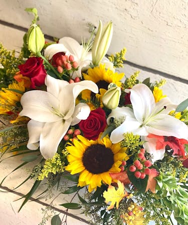 A gorgeous centerpiece built on a base of tropical greenery: Maria adds bold sunflowers, Casa Blanca Lilies, roses, berries, autumn leaves and more wonderful textures to create a most beautiful and memorable focal of your holiday table.