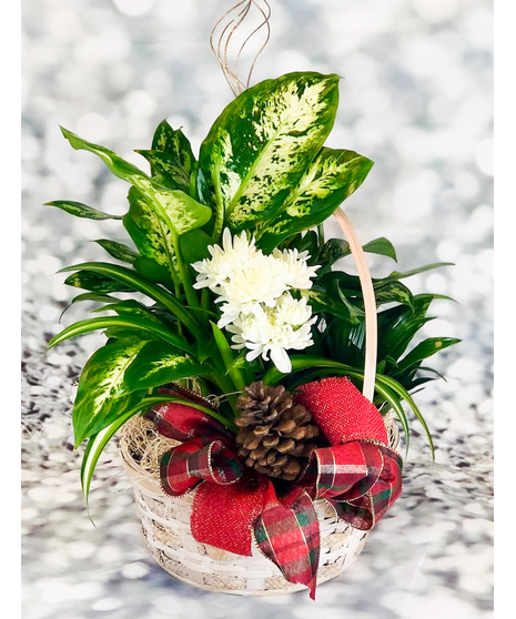 Plants of Peace is a wonderful way to welcome the holidays. A wonderful assortment of easy care, tropical plants are arranged in our 10" white wicker basket with seasonal fresh-cut flowers and adorned with holiday trim. A thoughtful and lasting gift.