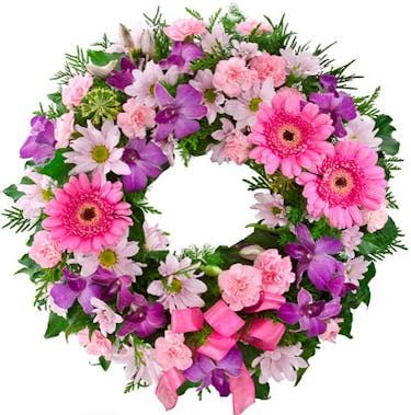 Peaceful Petals Sympathy Wreath is abundantly pretty! A fresh combination of pink and purple Gerbera Daisies, Orchids, Carnations, and Daisy Poms that are carefully arranged in a loving wreath to honor a beautiful life.